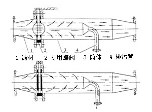 | 快速清污过滤器器具有阻力小,清污过滤质量高,安装操作方便等优点。在管路系统连续运行不停机的情况下,可进行清扫排污。过滤器工作时,蝶阀阀板处于全开状态,介质从左端进入滤材内侧,经滤材过滤后,清洁介质入管系统,杂质及污物截流在滤材的容腔内,清扫排污时蝶阀阀板处于关闭状态。排污管外阀门打开,由于过滤器内介质与排污管外产生压差,介质流向迅速改变,由滤材外侧流入内侧,将杂质及污物排出,在排污过程中滤器正常运作。